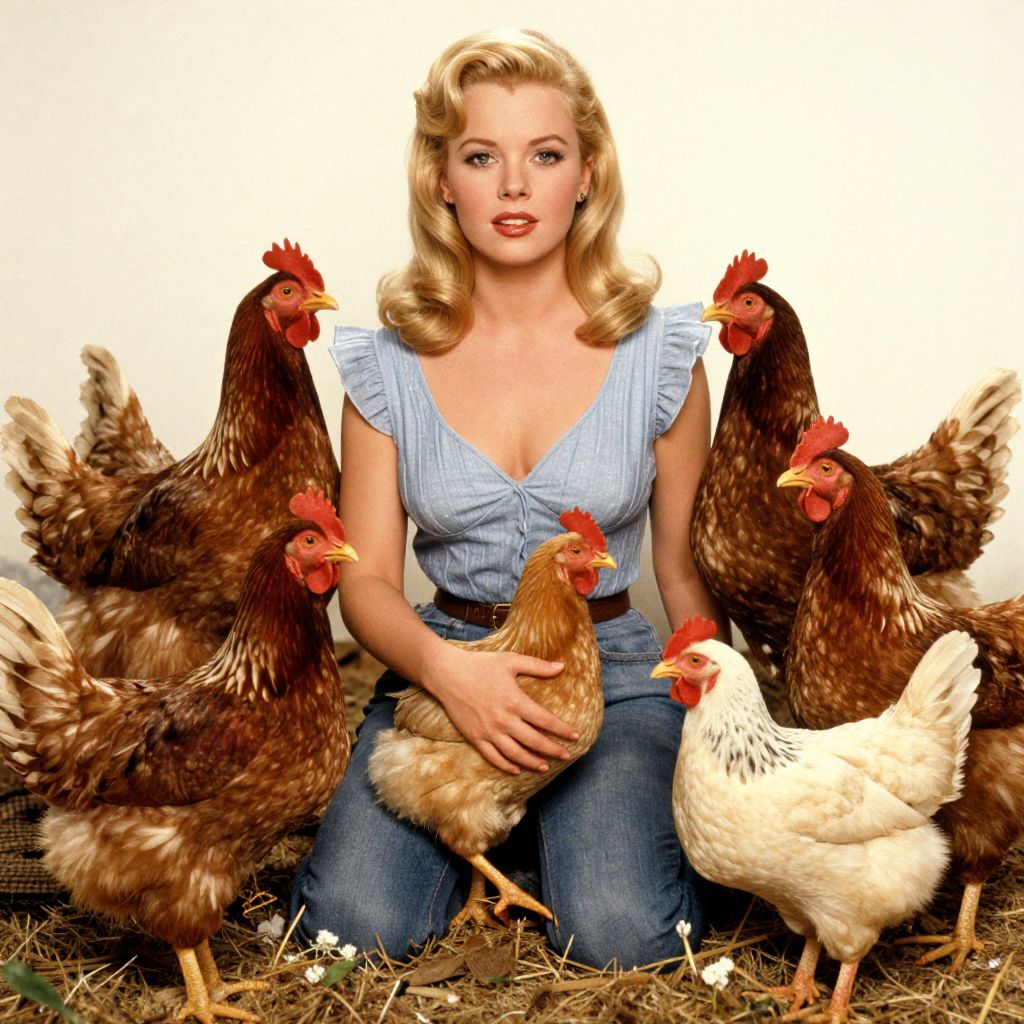 Photograph of a blonde woman with wavy hair, wearing a blue, sleeveless, V-neck blouse and blue jeans, kneeling on the ground surrounded by seven brown hens and one white chicken. The hens have red combs and are positioned around her, while she holds a brown hen in her lap. The background is a plain white, making the subjects stand out. The woman has a fair complexion and wears red lipstick. The ground is covered in straw and small white eggs are scattered around. The image has a vintage, pin-up style with bright, saturated colors.
