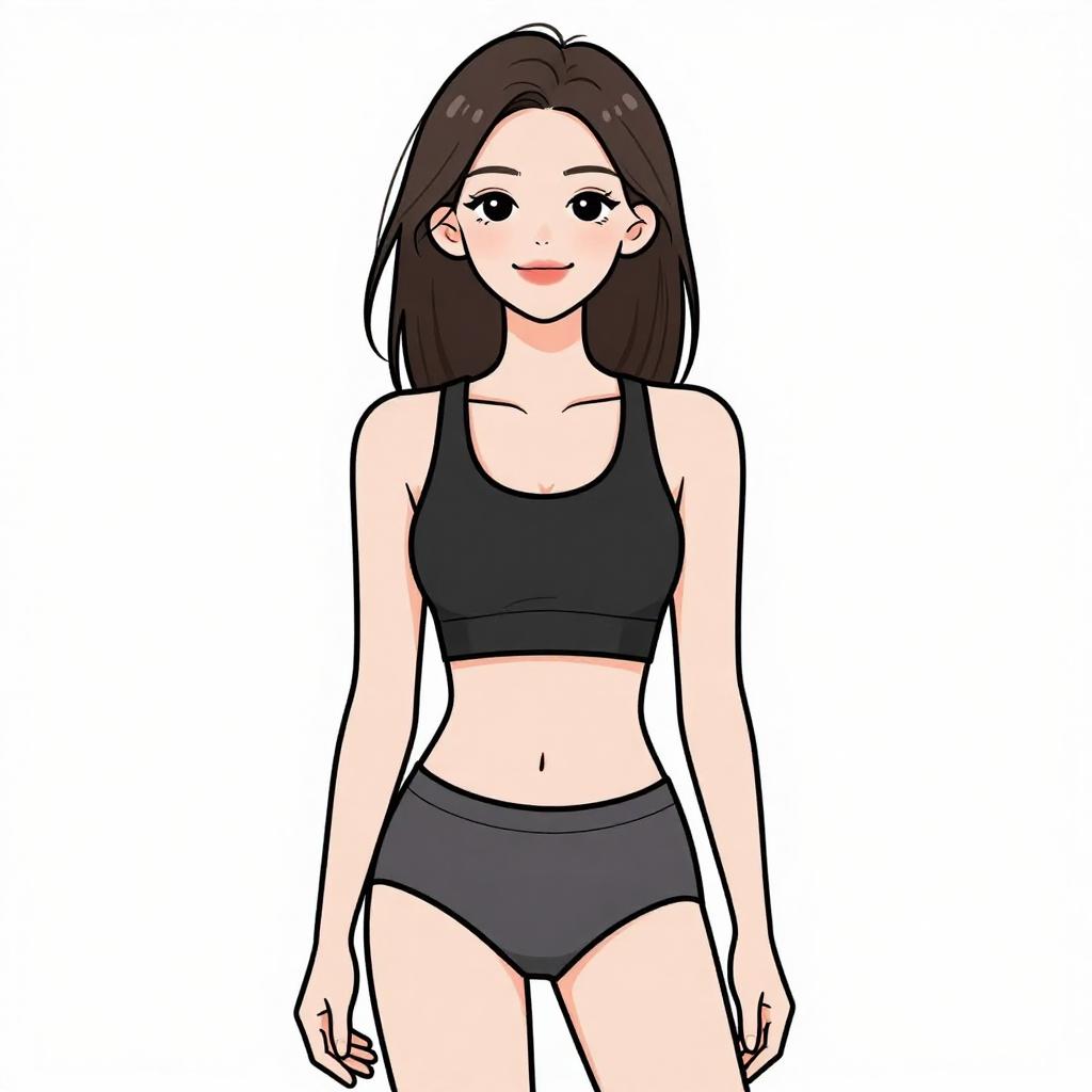 Woman with pretty face and pretty hair. smiling Woman, minimalist, black sports bra, scoop neck, thin straps, grey high-waisted briefs, cotton material, simple design, plain white background --sref 1467