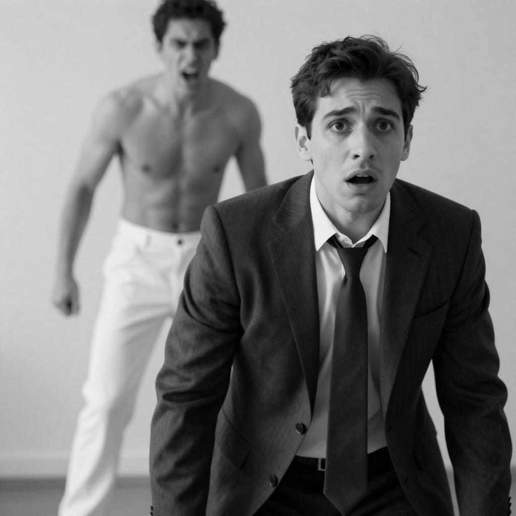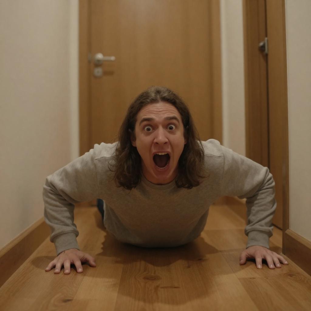 Terrified Man Crawling on Wooden Floor