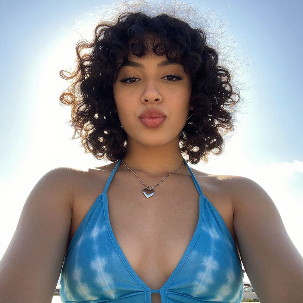 Photograph of a young woman with medium-dark skin and curly black hair, standing outdoors against a bright, sunlit sky. She's wearing a blue, tie-dye halter top that reveals her cleavage and a silver necklace with a heart pendant. She has full lips, dark eyeliner, and is looking directly at the camera with a slightly pouty expression. The sun is shining behind her, creating a halo effect around her head.