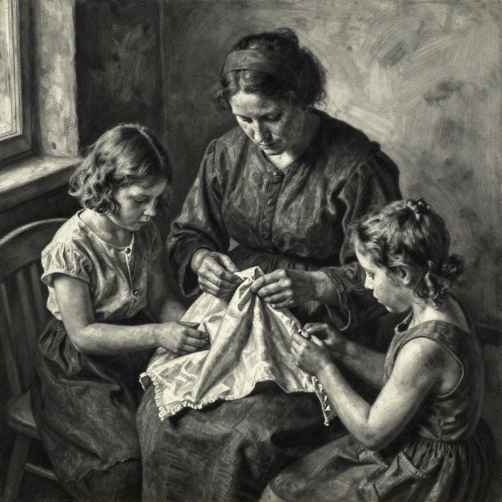 Charcoal painting by Käthe Kollwitz depicting a mother combing a child's hair, with delicate shading, flowing strands, and quiet intimacy, in a modest, dimly lit bedroom, with peaceful and loving, highly expressive and dramatic