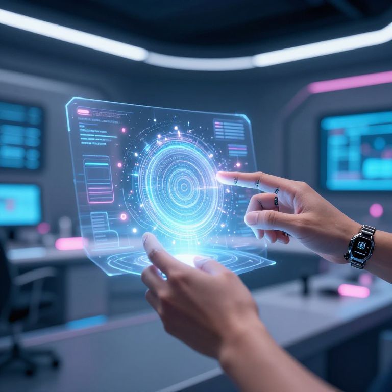 AI image hands manipulating a floating 3D interface made of translucent holograms and digital particles, combining realistic skin texture and subtle robotic enhancements, inside a sleek futuristic control room filled with ambient neon light