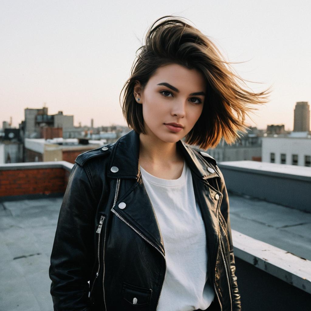 Textured Cut hairstyle on female model, wearing leather jacket, in urban street, captured in fashion editorial style with warm sunset glow.