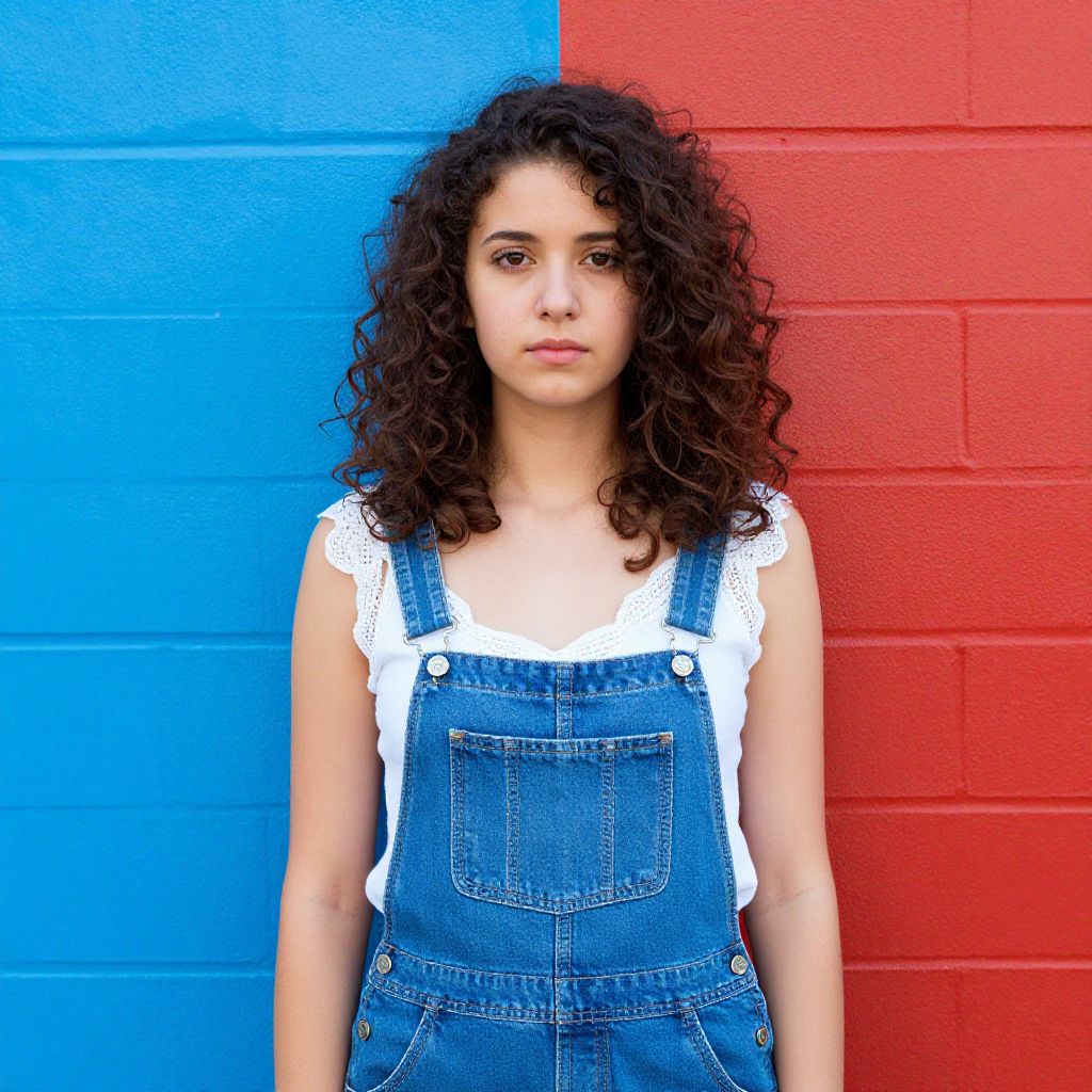 Photograph of a young woman with curly dark brown hair standing against a brick wall. She's wearing blue denim overalls with white lace trim on the shoulders and chest. The wall behind her is divided into two sections: one side is blue, and the other is red. She has a neutral expression and is centered in the frame. The image has a slightly surreal, enhanced color effect.