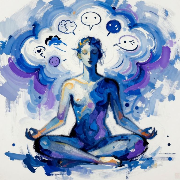 This digital painting features a blue-toned, abstract female figure seated in a lotus position, meditating. Her form is fluid and painterly, with swirling blue, purple, and white hues blending across her body. She has a serene expression, with closed eyes and a slight smile. Surrounding her head are simple, black line drawings of thought bubbles with various emotive faces, including a question mark, a smiling face, and a neutral face. The background is a mix of white and vibrant blue and purple brushstrokes, creating a dynamic, ethereal atmosphere. The overall style is modern and expressive, with a focus on abstract and emotional elements.