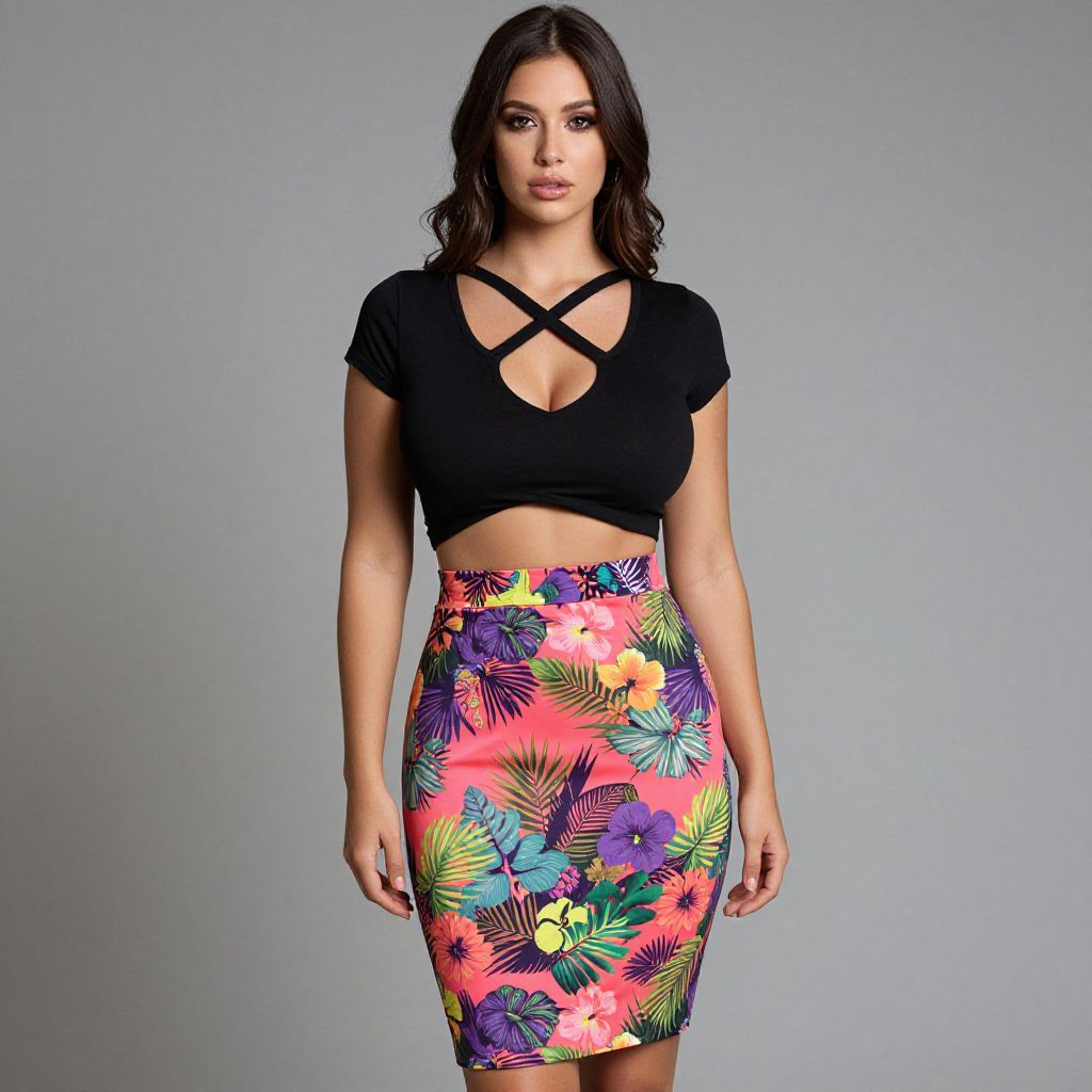 "Woman, chic, black crisscross crop top with a v-neckline, short sleeves, paired with a high-waisted pencil skirt featuring a vibrant tropical print with floral and foliage patterns in pink, purple, green, and yellow, knee-length.. Sexy. Pretty face and beаutiful eyes. Big breasts."