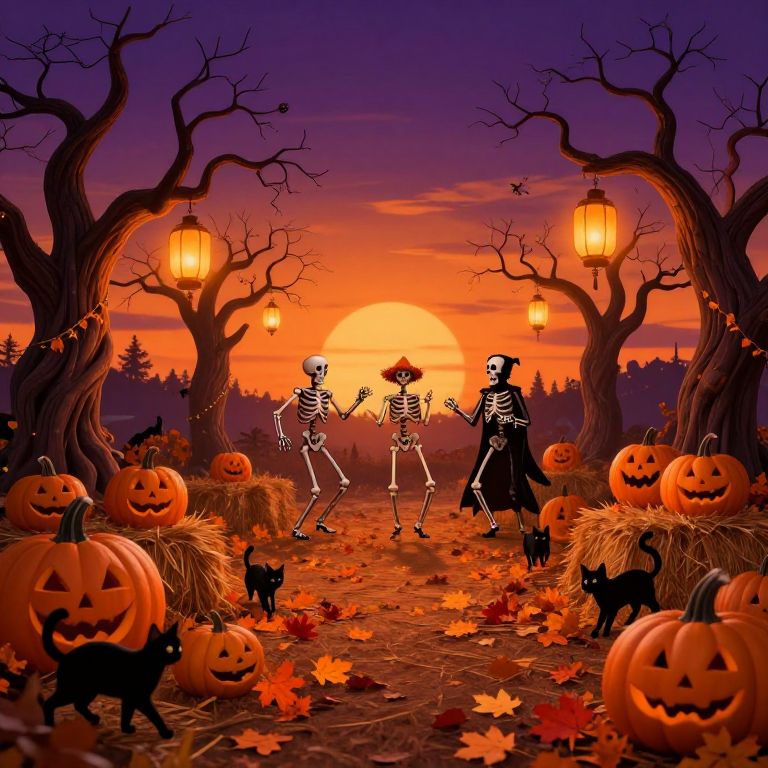 Halloween theme background depicting a whimsical pumpkin patch at dusk, lanterns hanging from crooked trees, friendly skeletons dancing, black cats prowling among hay bales, vibrant fall leaves scattered on the ground under an orange and purple sunset sky.