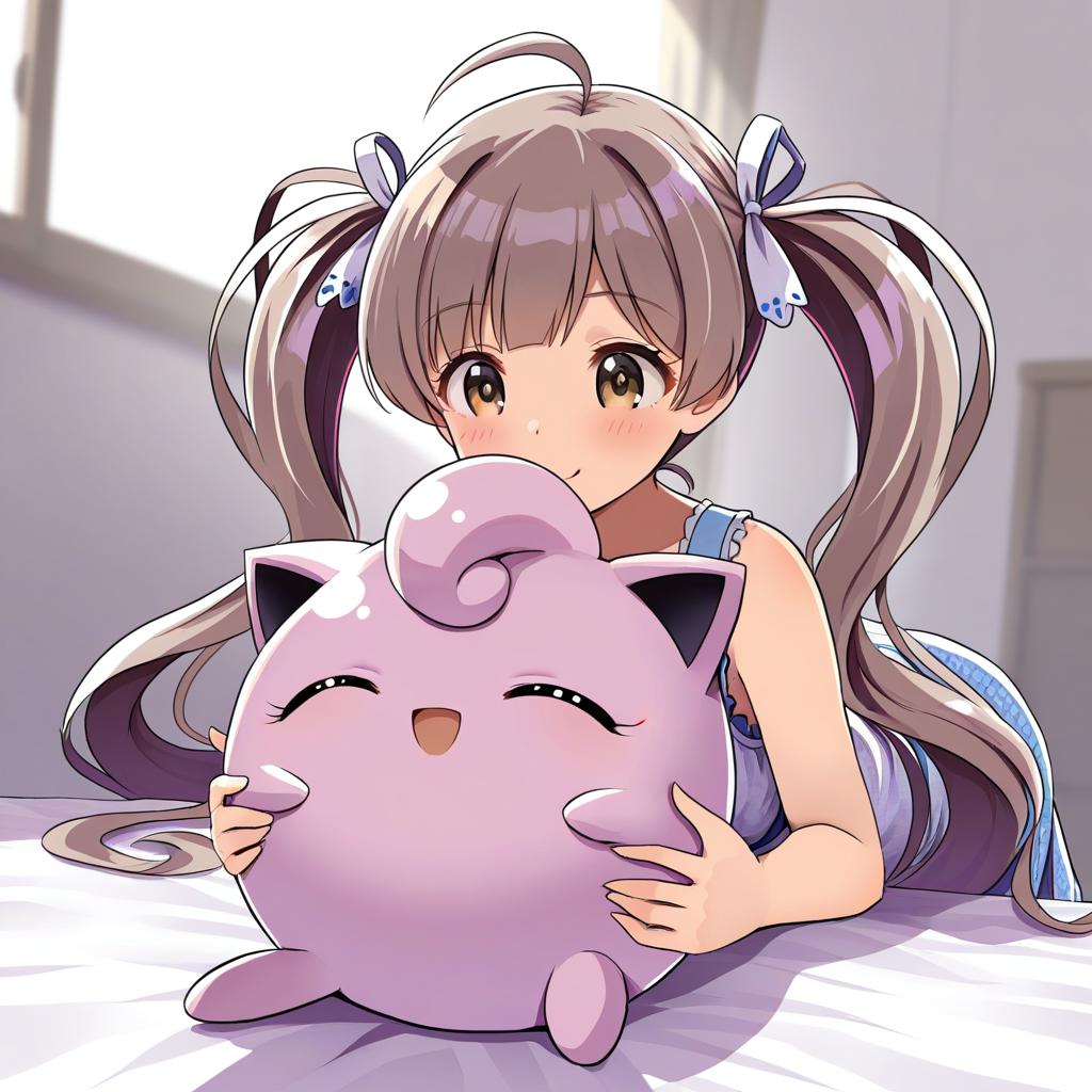 Digital anime-style illustration featuring a young girl with long brown hair styled in twintails, adorned with white and blue hair ribbons. She has brown eyes and a small build. The girl is holding a large, smiling Jigglypuff plush toy while lying on a bed with soft natural light coming from a window in the background. The artwork is inspired by the character Hakozaki Serika from Idolmaster and styled by artist shipii.