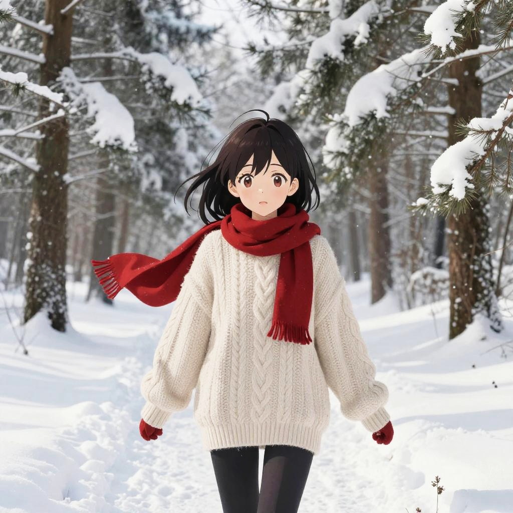 Anime girl in sweater walking through a snowy forest, fluffy white snow on pine trees, oversized turtleneck sweater with cable knit design, crimson scarf fluttering in the cold breeze, bright and clear winter daylight, anime character with delicate features