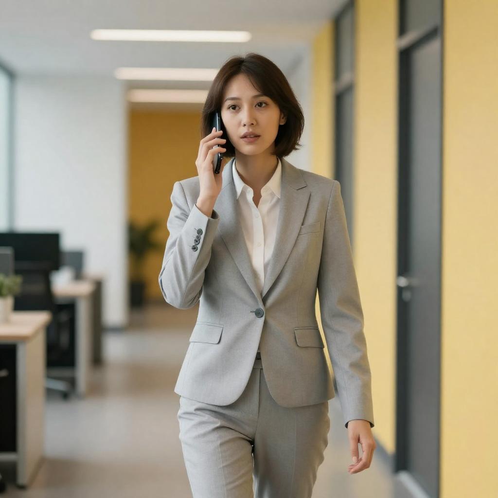 Photorealistic CGI image of a short-haired woman in a light gray business suit, talking on a smartphone. She walks through a brightly lit, modern hallway with black and yellow striped walls on either side. Background includes blurred office furniture.