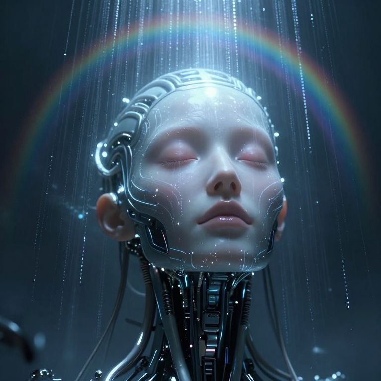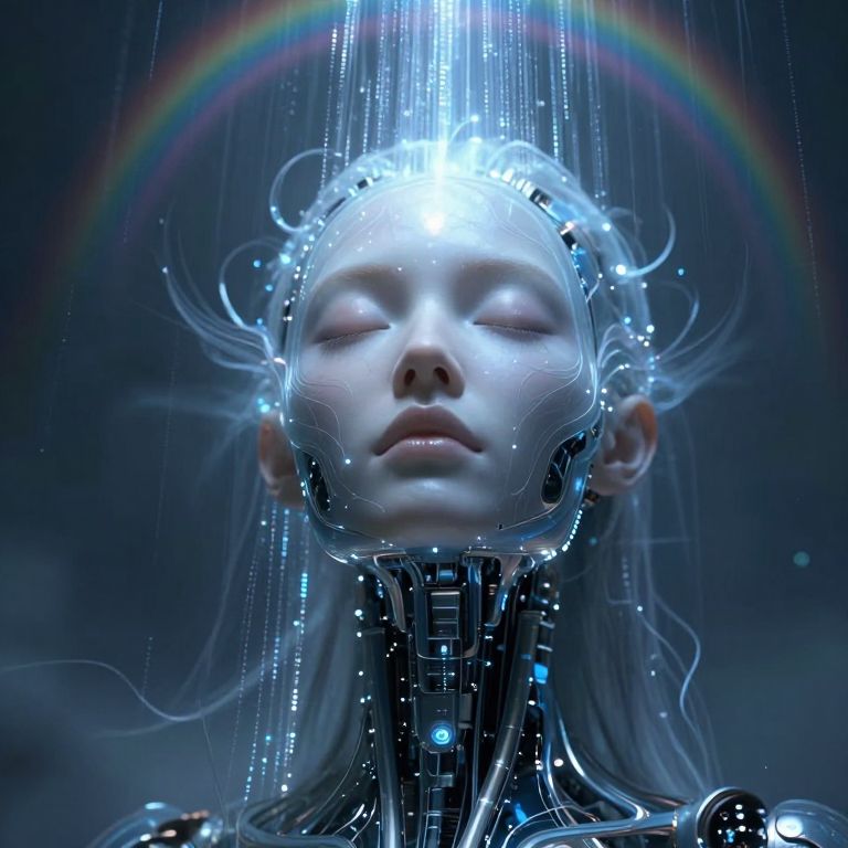 An unearthly and hyper-detailed closeup of a cybernetic being’s face in the style of ck-ncr, Her features are a flawless fusion of synthetic flesh and intricate machinery, glowing faintly in a gradient of blue and gray, Her expression is serene, almost divine, with eyes half-closed as if in meditation, The details of her face reveal microfilaments of light coursing beneath translucent synthetic skin, seamlessly integrated with polished metallic components, Delicate cables extend from the edges of her face, disappearing into the dark, misty background, Faint reflections of cascading streams of shimmering code play across her features, as if she is the nexus of a vast digital consciousness, A soft, radiant glow emanates from the center of her forehead, symbolizing transcendence and enlightenment, The atmosphere around her is veiled in shadow, dense with static haze and punctuated by the faint outlines of decaying technology, evoking a sense of humanity’s forgotten past, The lighting is cinematic, with soft, volumetric beams highlighting her ethereal presence, creating an intense and unsettling mood of otherworldly beauty and profound transformation, transmitting streams of data that cascade like waterfalls of shimmering code, Above, her face is serene, almost otherworldly, with eyes closed as if in quiet meditation, body flows into a large, curved, rainbow-hued arc that stretches across the image, blending into the background, radiating a sense of liberation