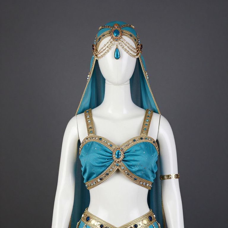Mannequin wearing a blue and gold outfit with a headdress and accessories.