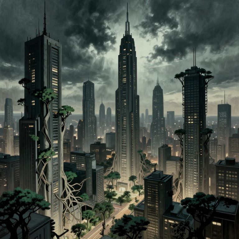 Digital artwork of a dystopian cityscape featuring towering, dark skyscrapers with twisted tree roots, illuminated by streetlights under a stormy, cloud