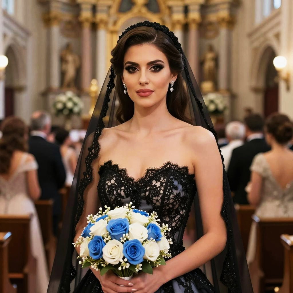 Photograph of a beautiful woman with dark, wavy hair and olive skin, standing in a grand, ornate church. She wears a strapless, black lace wedding dress with intricate floral patterns, and a long, sheer black veil. Her makeup is dramatic, with dark eyeliner and red lipstick. She holds a bouquet of blue, white, and yellow roses. The background features blurred, elegantly dressed guests and golden church decor. Her expression is calm and confident. The image has a slight digital enhancement effect, giving it a vivid, polished look.
