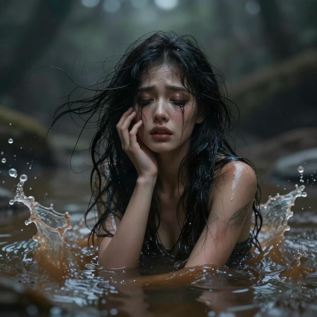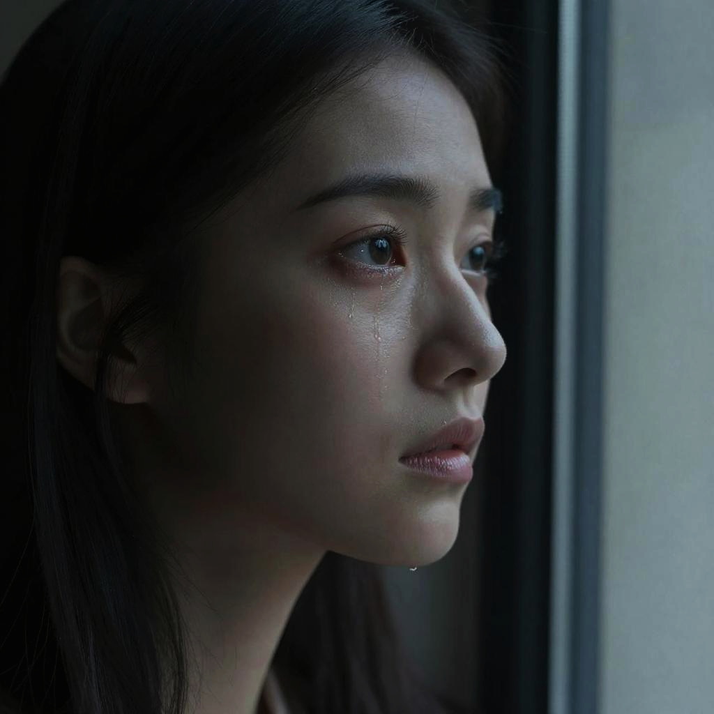 Realistic, photo-realistic, dark moody lighting, 1girl looking outside a window, perfect face, perfect eyes, (tears:1.2)