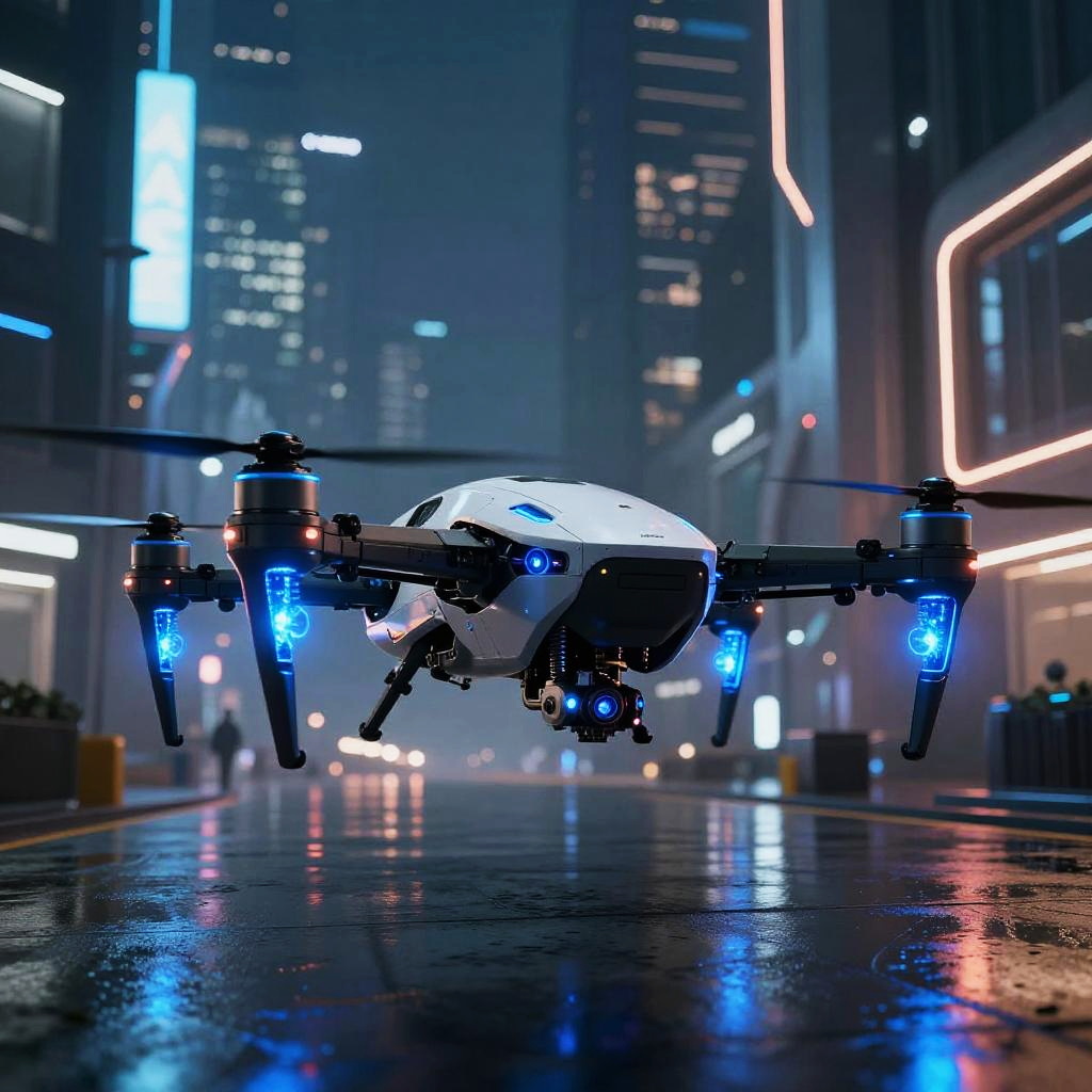 Raf4 conceptual drone prototype hovering over a high-tech urban environment, intricate mechanical details, glowing blue energy cores, sleek aerodynamic form, night scene with neon reflections on wet pavement, ultra-modern sci-fi aesthetic