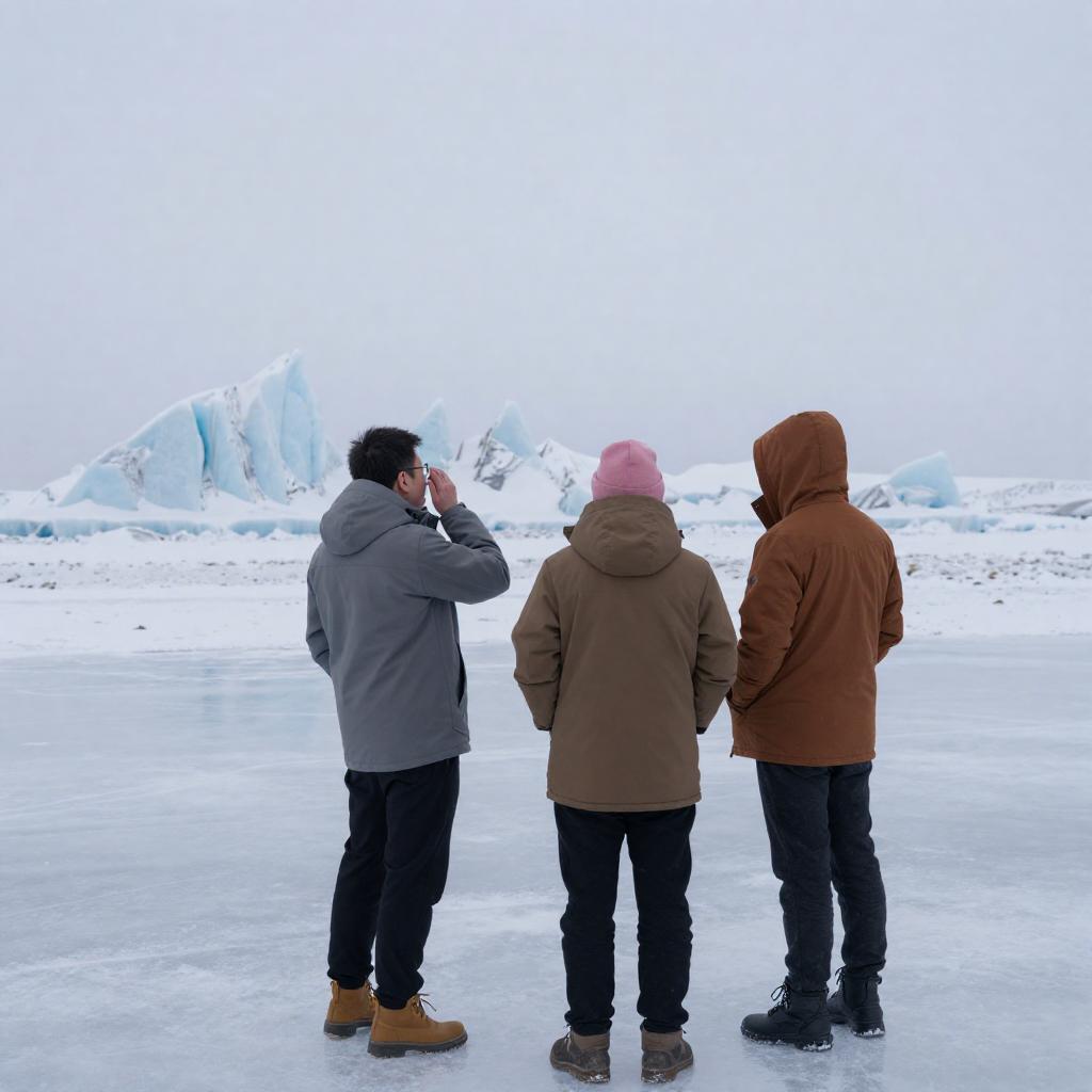 Photograph of three people in winter clothing standing on a snowy ice field. Two men in gray and brown jackets, one in a pink hat, and one in a brown hooded jacket. They face a vast, icy landscape with jagged ice formations in the background. The man in gray holds his hand to his face, looking up. Snowy terrain and ice ures dominate the scene. Overcast sky.