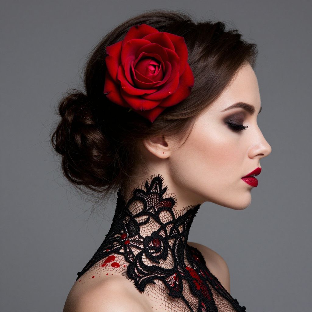 Elegant profile of a woman adorned with a vibrant red rose in her hair, surrounded by splattered red droplets and intricate black lace patterns cascading down her neck and shoulders.