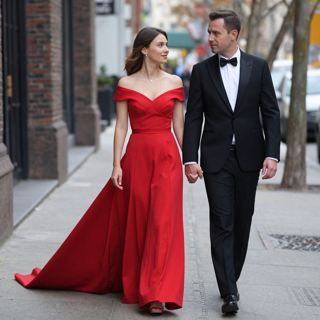 Elegant couple strolling hand-in-hand down a city sidewalk, the woman in a striking off-the-shoulder red gown with a flowing train and the man in a classic black suit, both exuding sophistication against the urban backdrop.