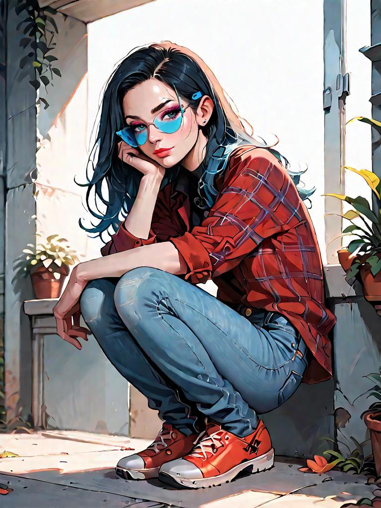 Full body shot of a young woman with black hair and blue eyes posing indoors on a pale blue stool. She is wearing a fitted black ribbed tank top, light blue high-waisted jeans, and white sneakers with blue and orange details. The setting features natural light with plants on a windowsill in a modern, bright room.