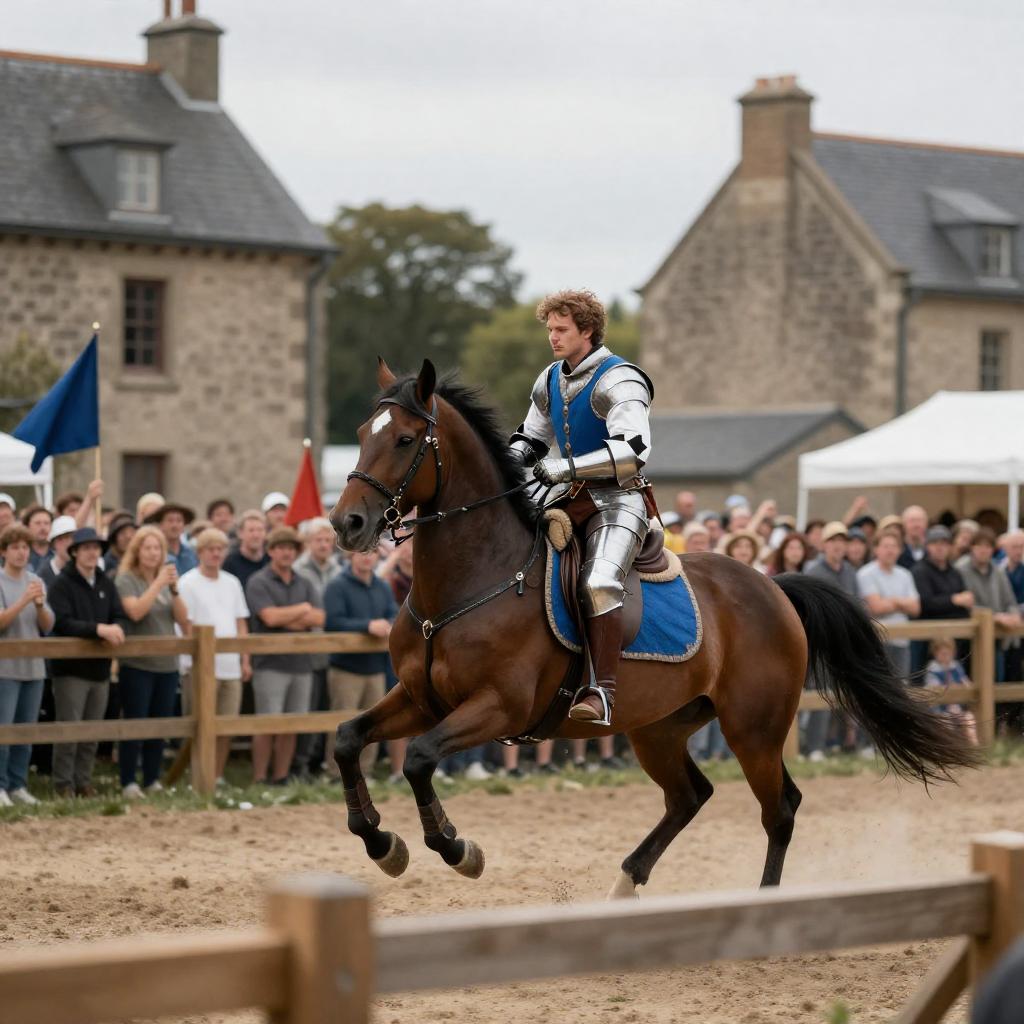 Man in white shirt and brown pants riding brown horse with blue and silver armor, charging forward in medieval jousting arena. Crowds in background, holding flags, watching intensely. Stone buildings, overcast sky. Wooden fence in foreground.