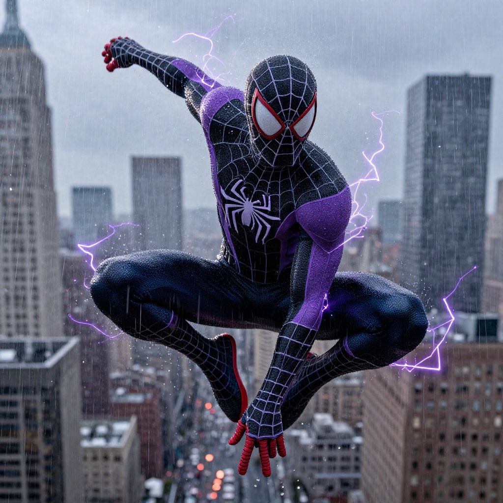 Black and purple Spider Man swinging through a rainy metropolitan skyline, rain droplets catching the light and creating reflections, dramatic lighting with electric purple energy trails, detailed costume texture with spider motifs, dynamic comic book style