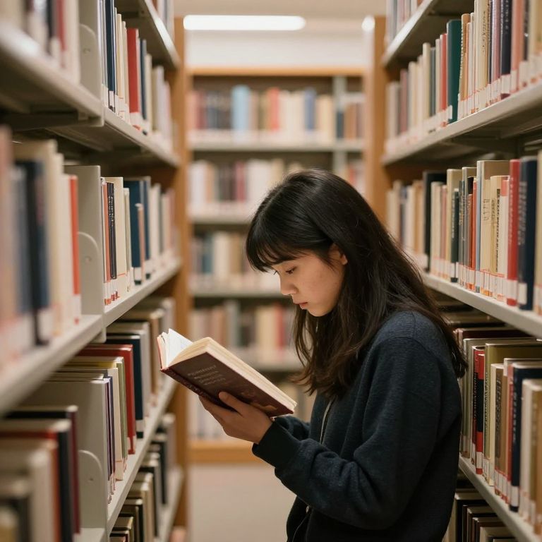 Photograph of an Asian woman with long, straight black hair and bangs, wearing a dark blue sweater, standing in a library aisle. She is intently reading a book, holding it with both hands. The library shelves on both sides are filled with colorful books, creating a symmetrical and inviting background. The aisle is narrow, with the shelves extending into the blurred background, highlighting the depth of the library. The lighting is bright, casting a warm glow on the scene. The woman's profile is in sharp focus, contrasting with the softly blurred bookshelves.