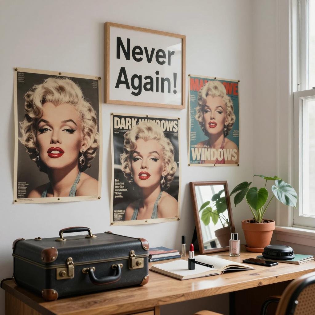 A cluttered desk with a "Never Again!" sign above. Multiple Marilyn Monroe posters, including a close-up and a magazine cover with the headline "Dark Windows." A vintage suitcase in the foreground, red lipstick, and a mirror reflecting the room. A potted plant in the background. Bright, natural light from a window on the right.