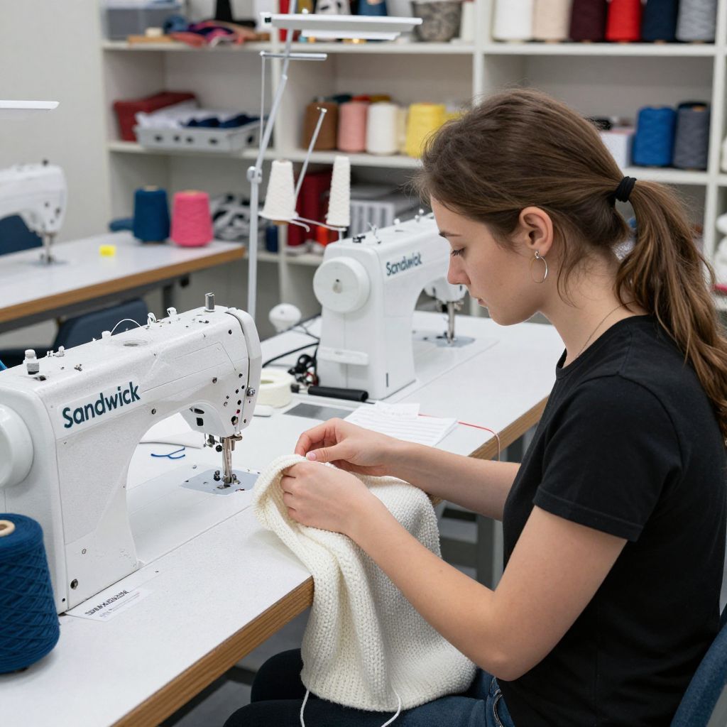 Woman focused on crafting a white knitted item while seated at a well-lit workstation featuring two sewing machines, colorful yarns, and organized shelves in the background, showcasing the meticulous process within the Sandwick knitwear factory.