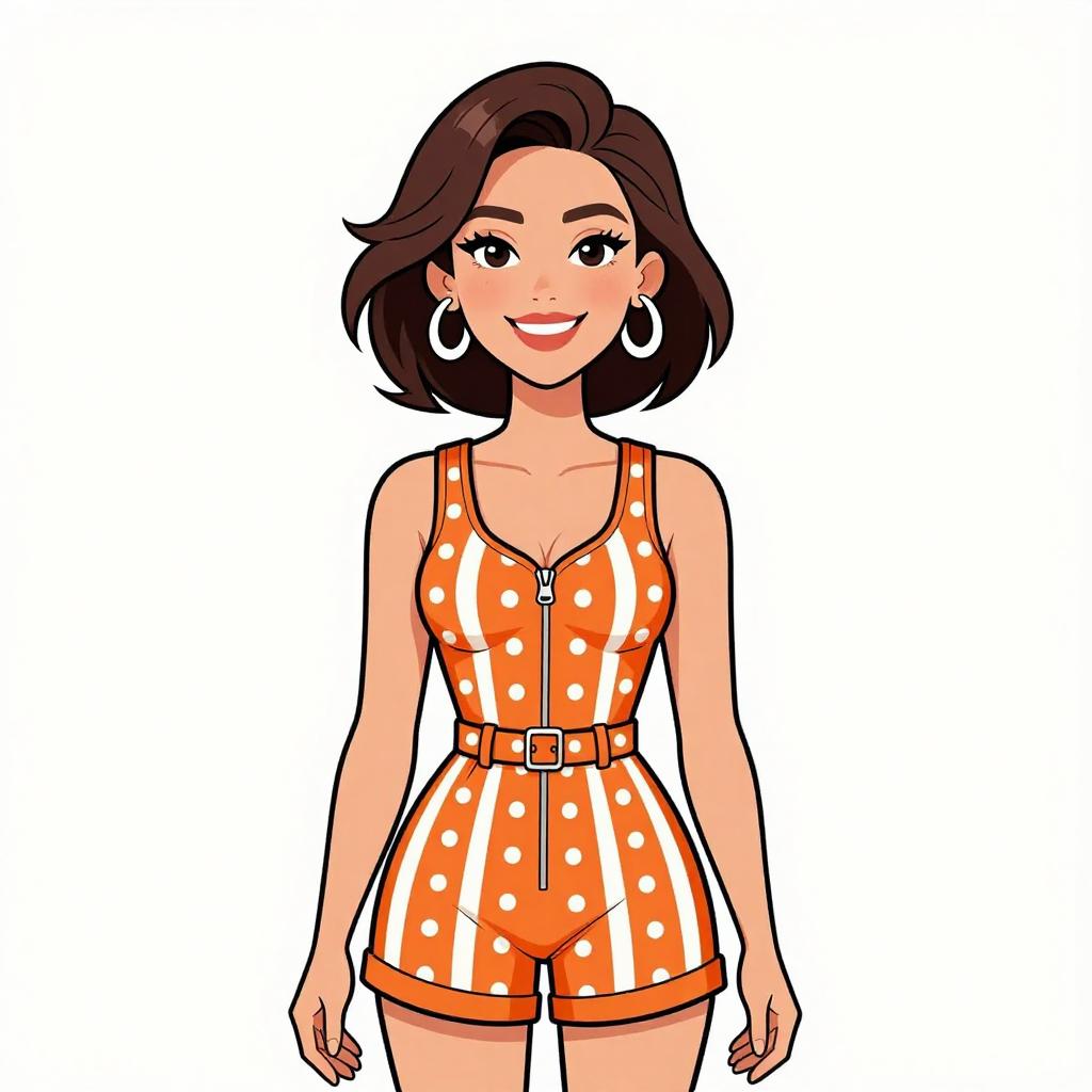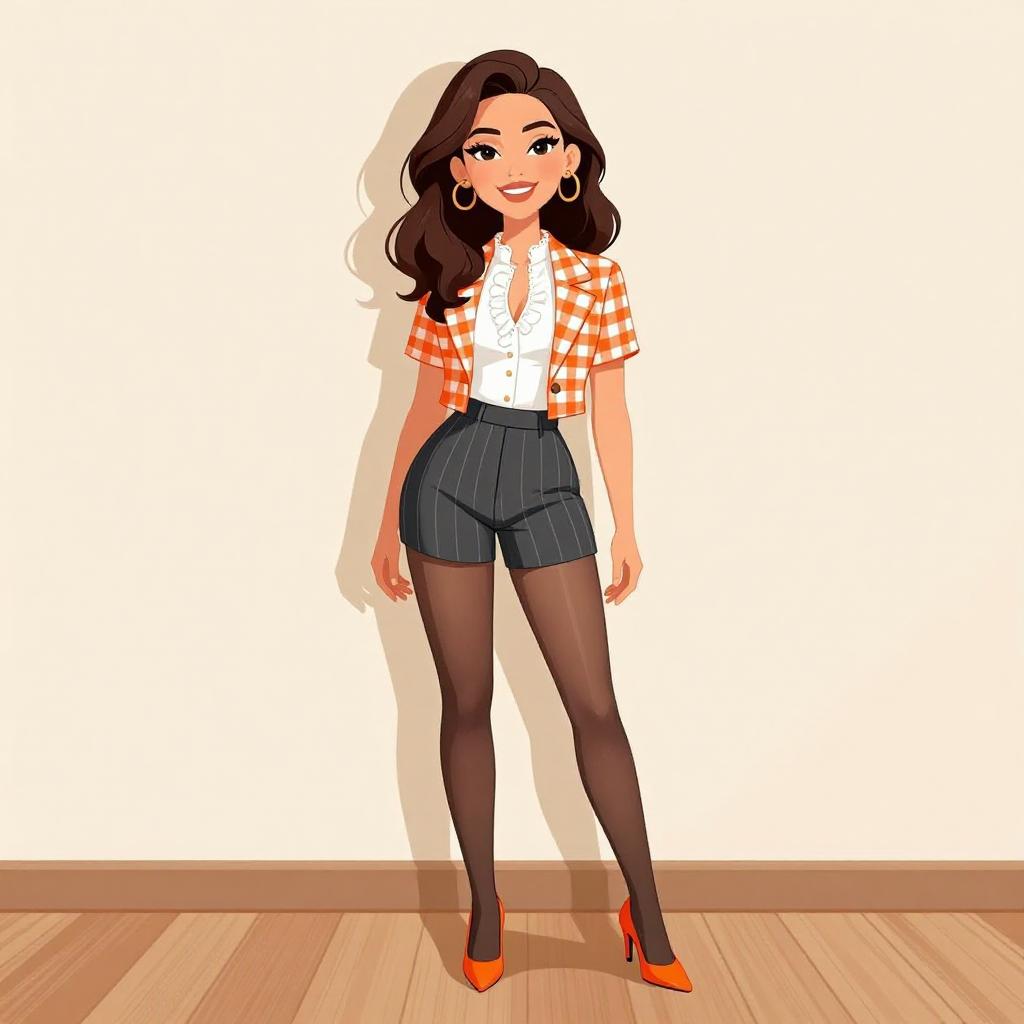 Woman with pretty face and pretty hair. smiling Woman, retro-inspired, orange and white checked short-sleeved blazer, white lace-trimmed blouse with ruffled front, high-waisted gray pinstripe shorts, sheer black tights, tangerine pointed-toe heels, indoor setting with plain wall and wooden floor. --sref 1467
