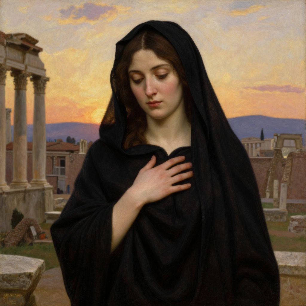 Dante Gabriel Rossetti's 'The Roman Widow' (1874) portrays a solemn woman draped in a black shawl, her hand gently resting on her chest, set against a backdrop of ancient Roman ruins under a warm, sunset sky.