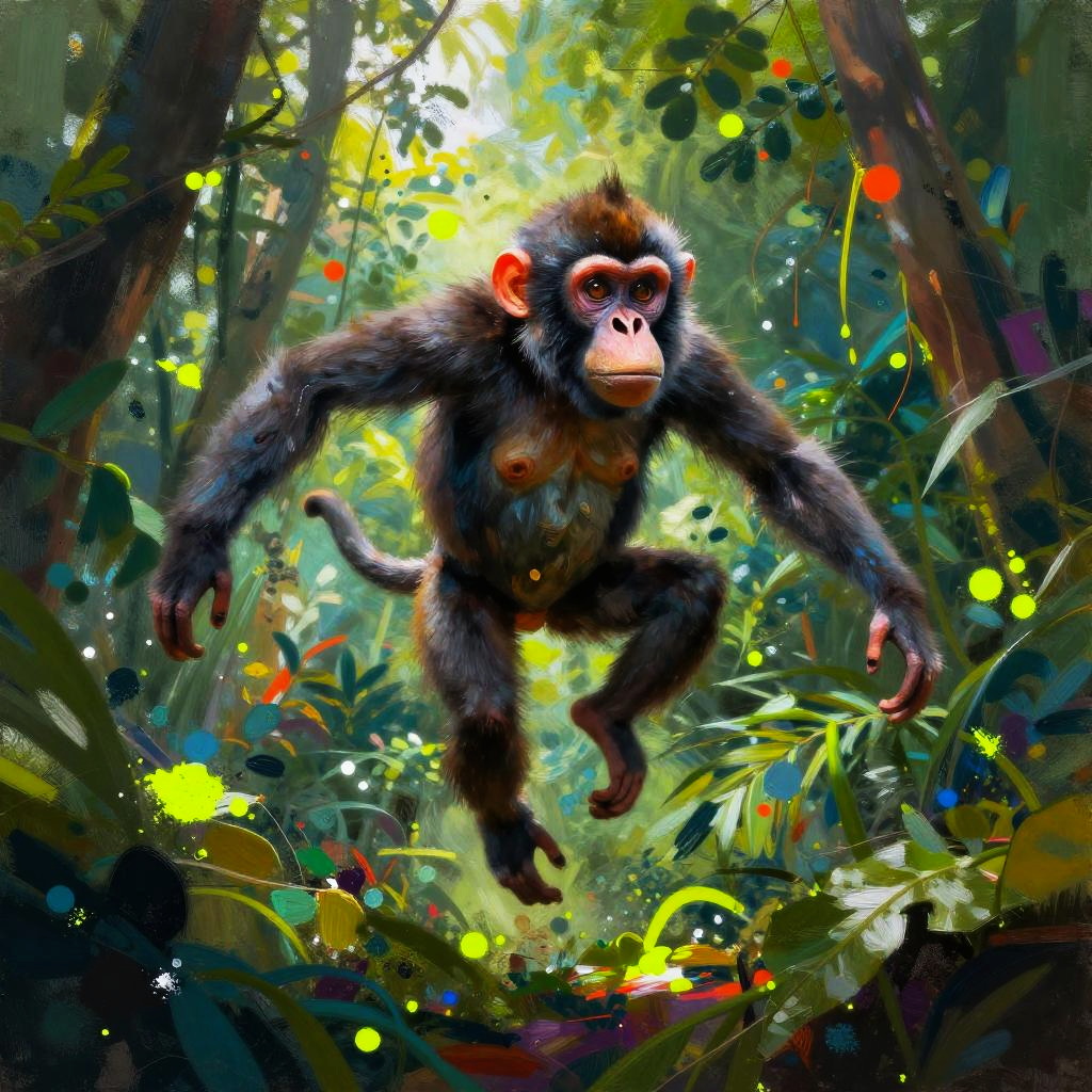 A deformed monkey with surreal and grotesque features, posed mid-leap in a dense jungle, vibrant splashes of neon foliage around, chaotic and expressive brush strokes, a mixture of hyperrealism and abstract art, dramatic shadows and highlights