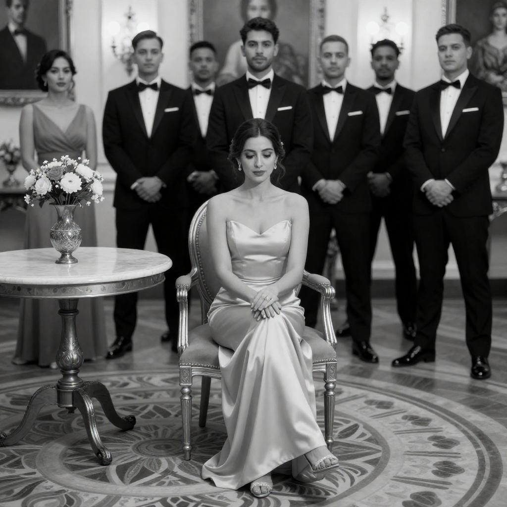 Black-and-white photograph. Elegant woman in satin gown sits in ornate chair, focused, hands clasped. Six men in tuxedos stand behind, one woman in dress to left. Patterned floor, round table with vase, framed pictures on wall.