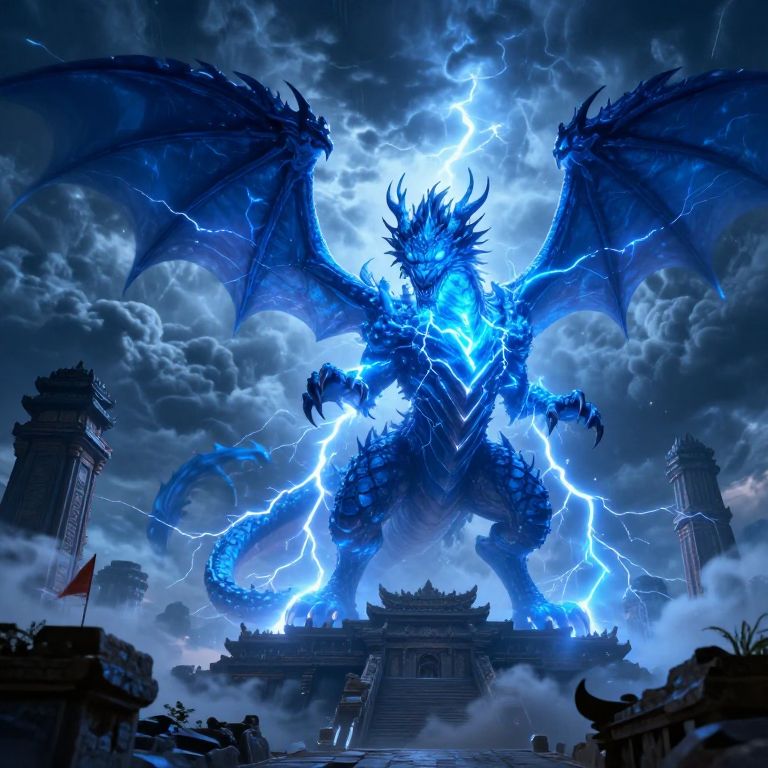 Blue and white furry mythical beast roaring atop ancient ruins under a stormy sky, lightning illuminating swirling clouds, intense atmosphere, fantasy epic artwork.