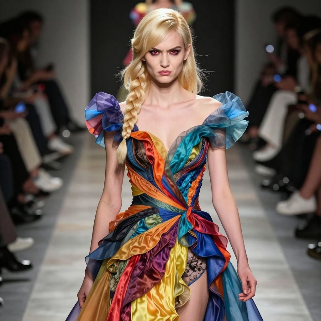 Girlvn01, 1girl, (smile:1.4) Stunningly Beautiful Girl, Haute_Couture, designer dress, wearing Haute_Couture, posing for a picture, fashion show, Long shaped face, angry, crazy, dark red eyes, Sandy Blonde side-swept hair, short hair, long ringlets, catwalk \(walkway\), colorful, vivid colors, masterpiece, best quality, absurdres, highest quality, amazing details, 8k, aesthetic