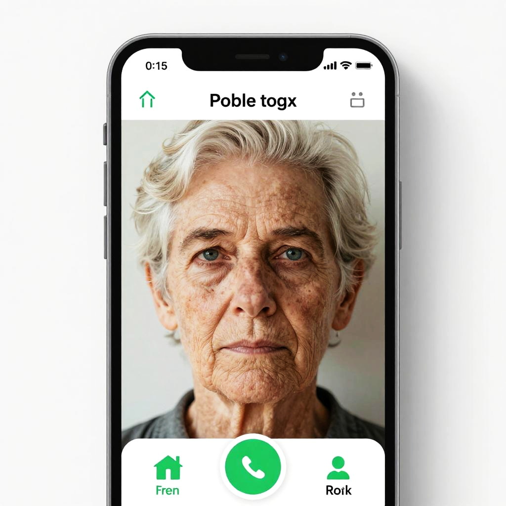 A mobile phone screen displaying an old age filter online at work, capturing the transition process from youthful skin to aged appearance with realistic textures, enhanced facial details, and soft shadows in a clean and sleek app design.