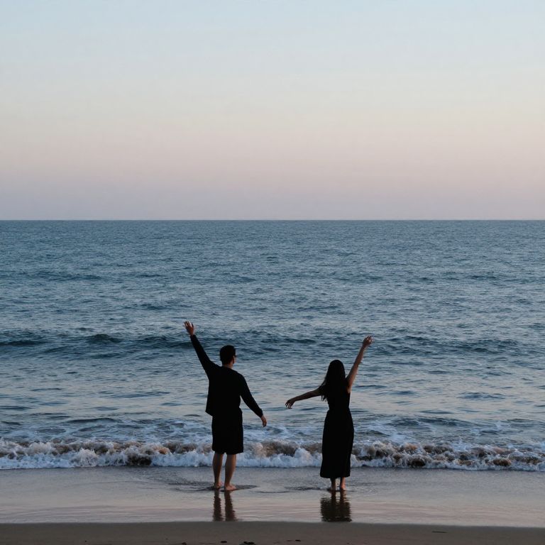 Amidst the rhythmic ebb and flow of waves, two figures stand on the shore, their silhouettes etched against the horizon, embodying a timeless dance between freedom and introspection, where the vastness of the sea mirrors the depths of their inner worlds.