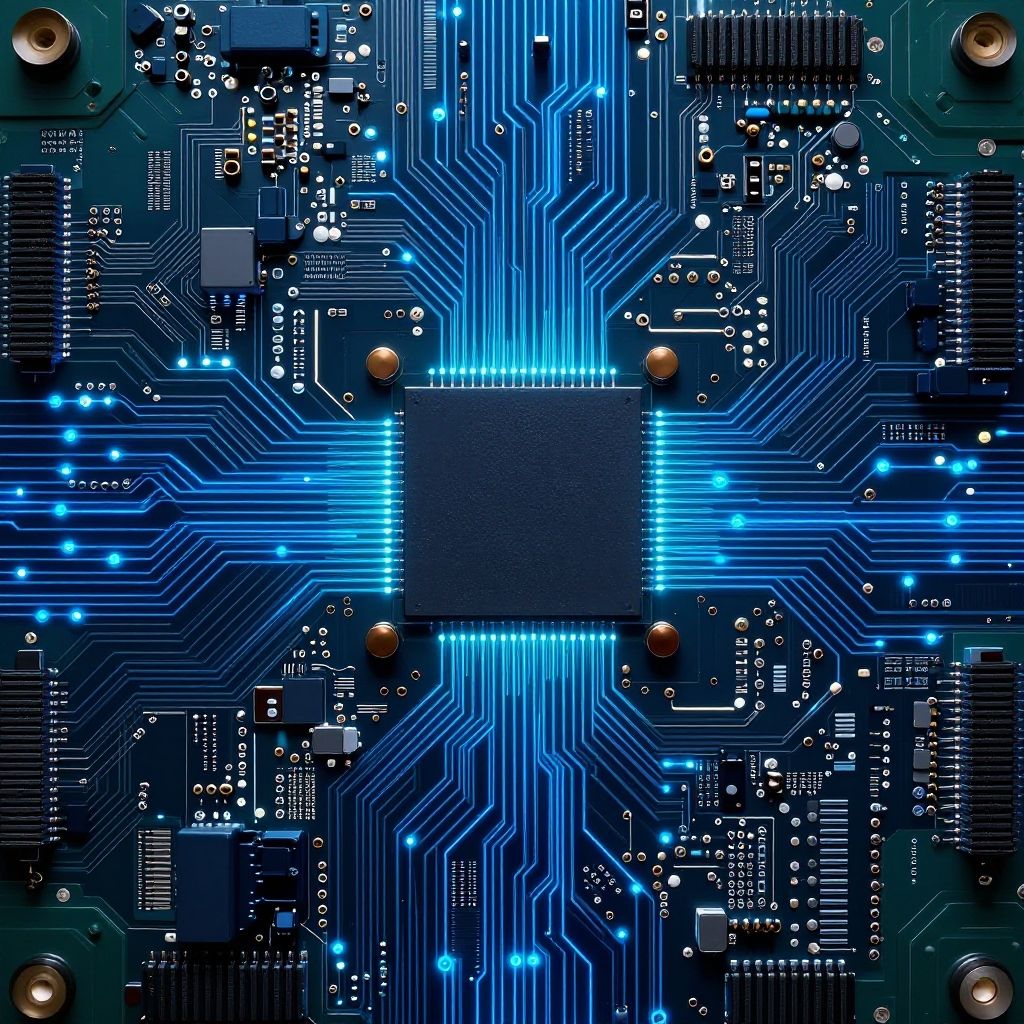 Top down view of a complex circuit board, intricate pathways and components, glowing connections, futuristic tech theme, high resolution, vibrant blues and metallic tones