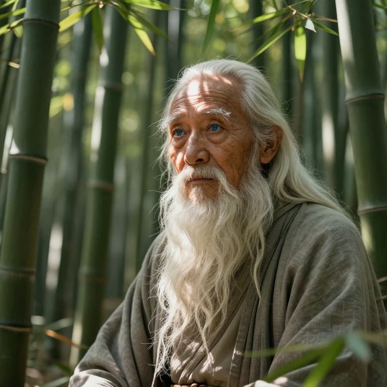 Envision a portrait photograph of an enigmatic sage with weathered skin and wistful blue eyes, seated in a serene Zen garden bathed in soft golden sunlight. The sage's expression exudes serenity intertwined with profound wisdom; his gaze transcends our realm. Adorned in a simple yet elegant robe decorated with delicate patterns, the sage embodies spiritual nature. This portrait captures an emotional spectrum transitioning from peace to intrigue as one studies the sage's face and follows their eyes towards the distant horizon, hinting at a deeper understanding of life's mysteries just beyond reach.
