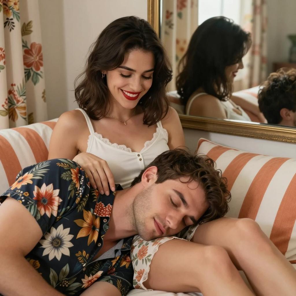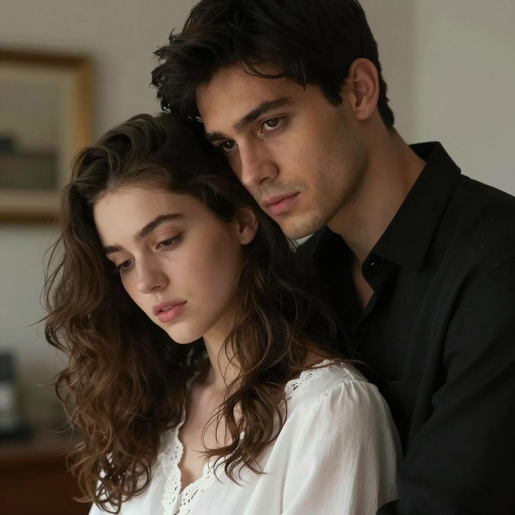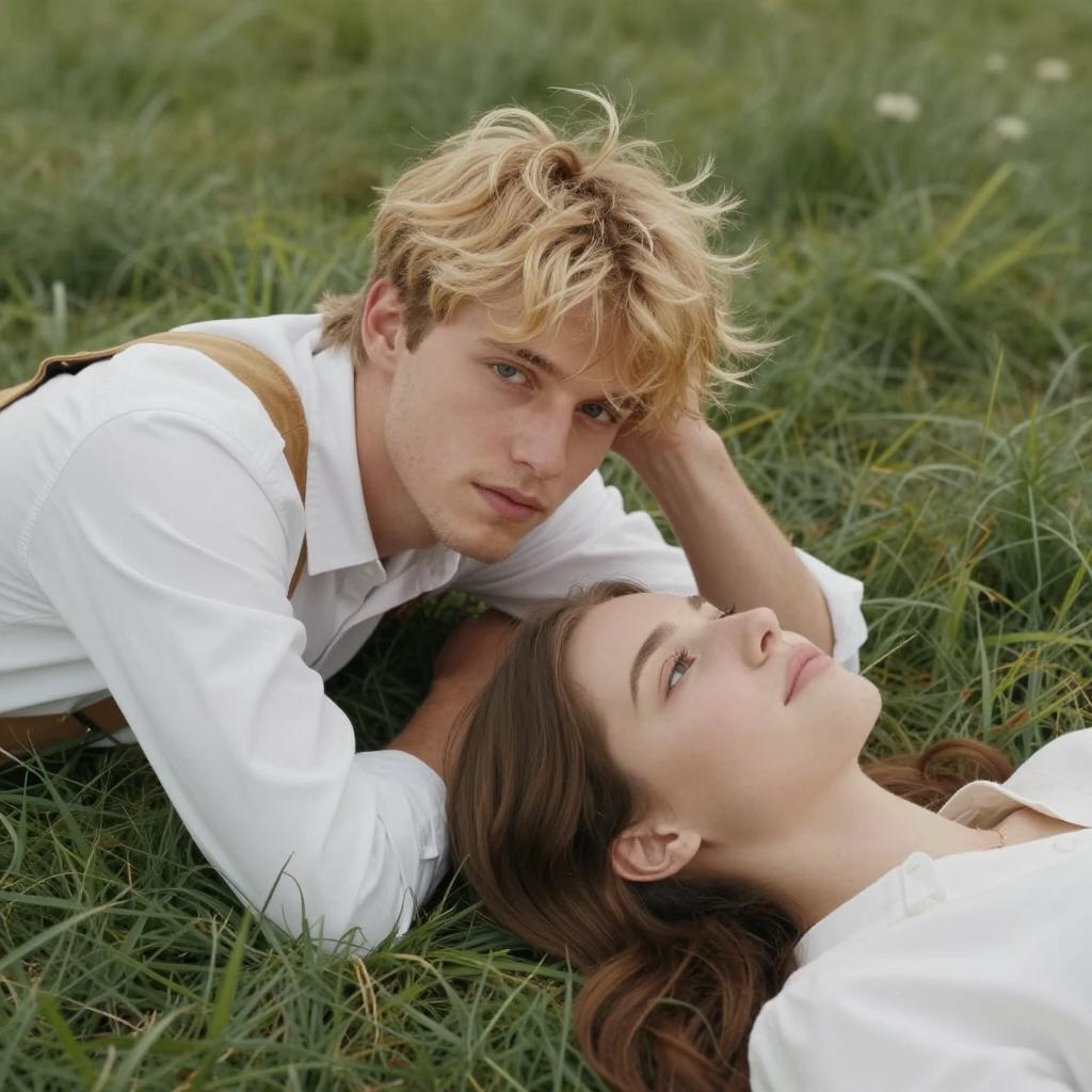 A man and woman lying on a haystack. Man with dark hair, black shirt, white patterned vest, relaxed expression. Woman with brown hair, beige headscarf, black patterned vest, looking down. Straw background, man's arm over his chest, woman's arm near her side. Both with fair skin.
