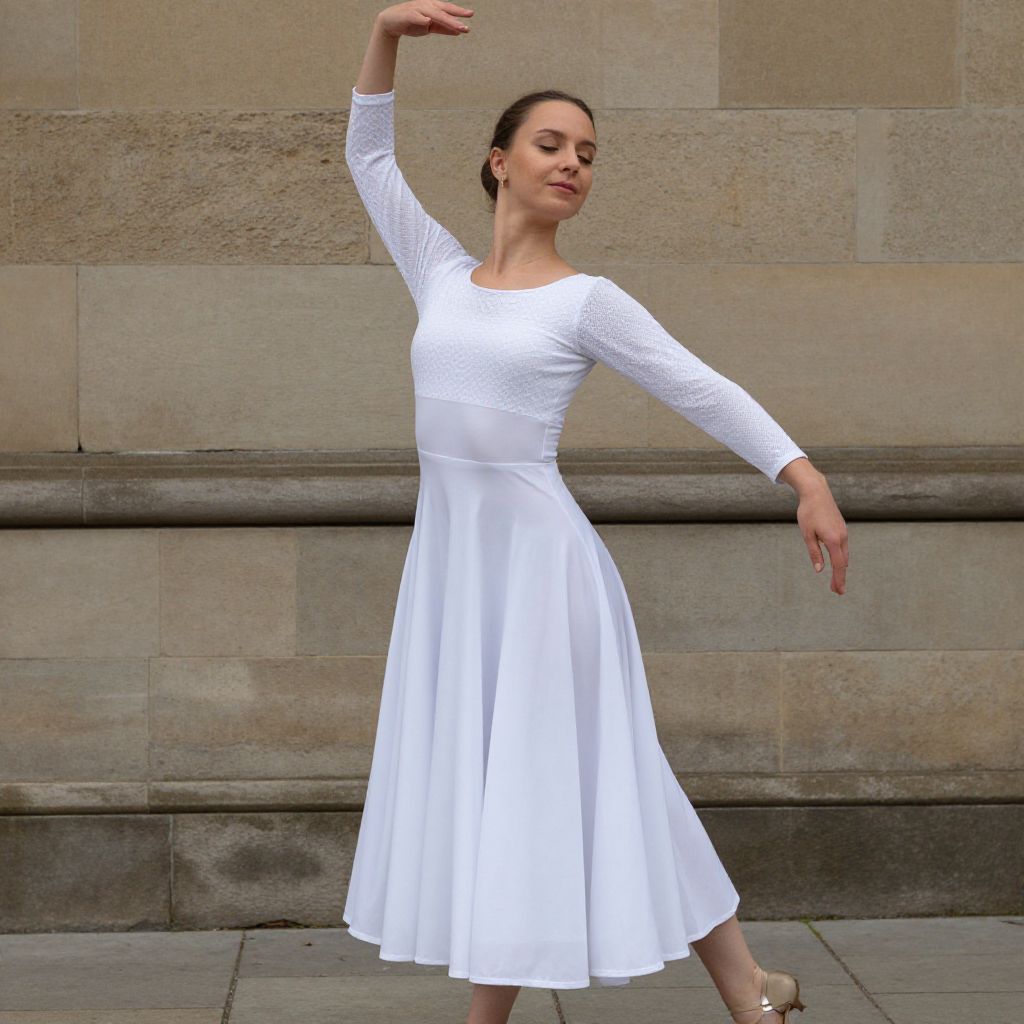 Photograph of a young woman with light skin and dark hair in a white, long-sleeve, lace-textured dress, dancing gracefully in front