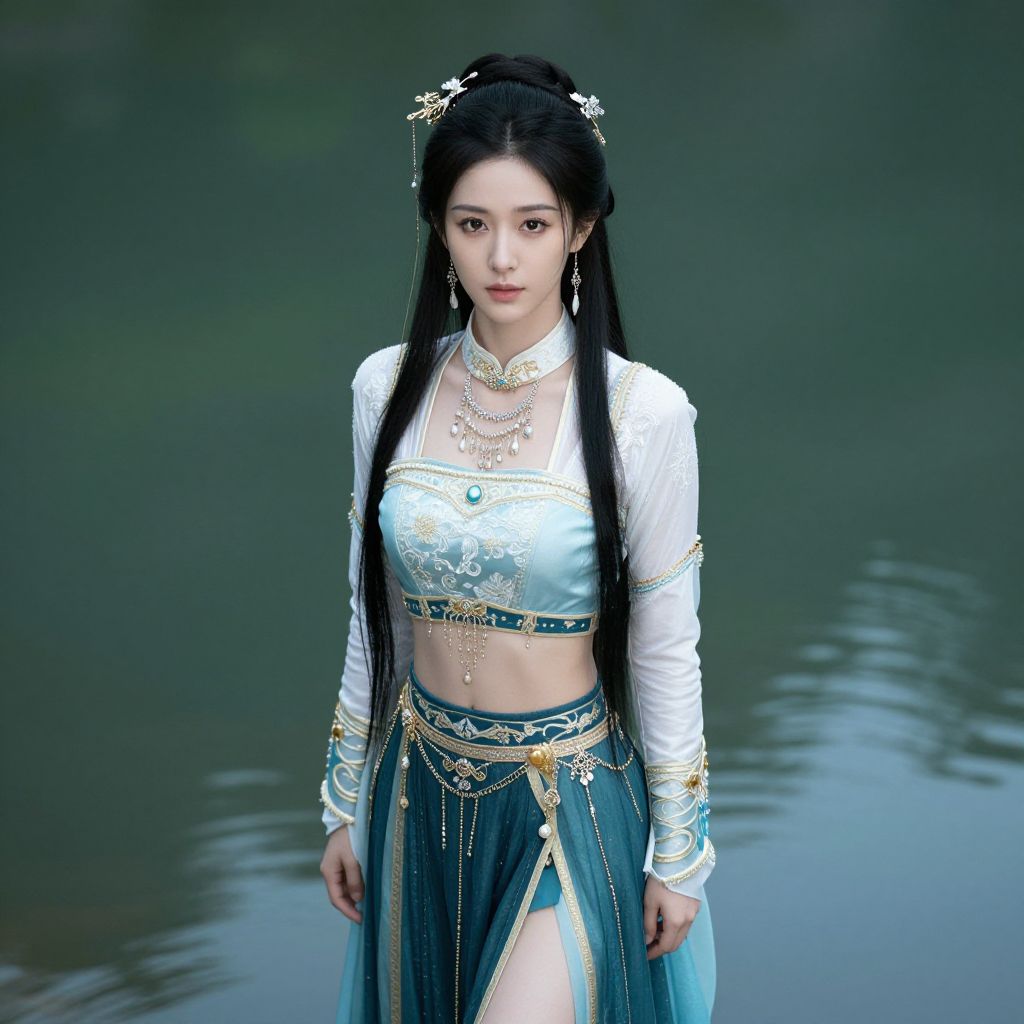 "blades glory costume woman, 1girl, solo, black hair, long hair, dress, jewelry, realistic, earrings, white dress, closed mouth, looking at viewer, hair ornament, sash, long sleeves, upper body, puffy sleeves, chinese clothes, asian Realistic photo of casual sexy person with pretty face"