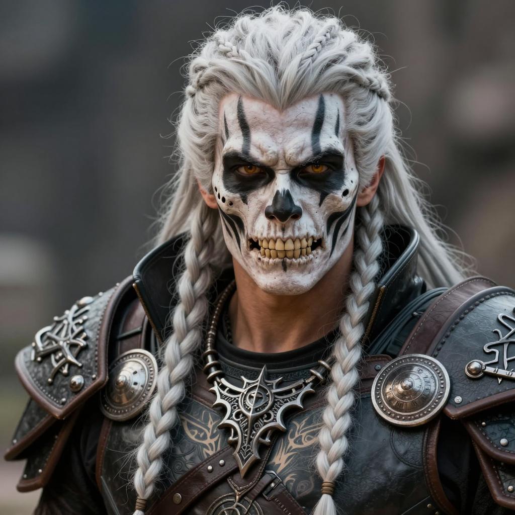 Close-up portrait of a male warrior with white long braided hair and tribal skull makeup featuring black stripes and detailed face paint. The subject has intense yellow eyes, missing front teeth, and is wearing elaborate leather armor with metal embellishments and an intricate necklace. Visible front chest tattoo and large black collar add to the fantasy aesthetic. Outdoor setting with a blurred background and high contrast lighting.