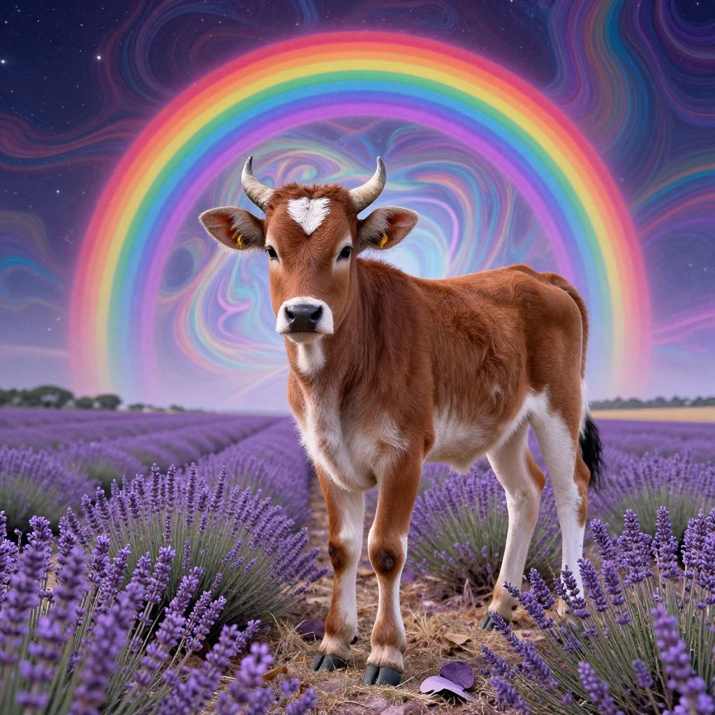 Psychedelic style (((Camahueto (Chilota) ├в┬А┬У One-horned calf))). With a rainbow nebula background . Epic dynamic lighting . (M1)(49. Dreamy Lavender Fields in Provence))(D)(Shots)=, reflective, psychedelic, (((In the art style of chris dyer)))=((Vivid, HDR, Canon50, 8K, Hyper Realistic, Dramatic, Epic, Dynamic Contrast, Cinematic Lighting)) (((Zoomed Out, - Generate images with sharp edges and fine details.- Produce high-resolution images with no blurriness or distortions.- Create images with clear and well-defined subjects.- Ensure that the output images have crisp lines and distinct features.- Generate images with vibrant colors and accurate tones.- Avoid noise or artifacts in the generated images.- Focus on producing clear textures and patterns in the images.- Emphasize clarity and definition in all aspects of the generated images.- Prioritize the sharpness and clarity of the main subjects in the images.- Optimize the AI model to produce clear and visually appealing images., By art germ . Vibrant colors, swirling patterns, abstract forms, surreal, trippy