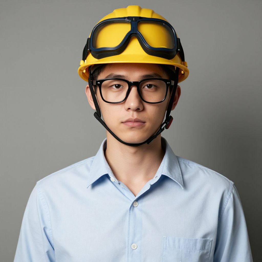 Photograph of a young Asian man with glasses, wearing a yellow hard hat and safety goggles, and a light blue button-up shirt, against a plain