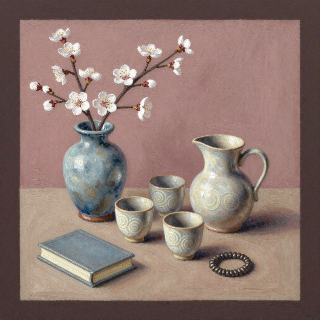 Soft oil pastel painting of a still life featuring a glazed icy blue vase with white cherry blossoms, three hand-thrown earthenware cups with swirl motifs, a matte feldspar-colored ceramic pitcher, a small book, and a coiled bracelet. The composition is set against a muted dusty rose plaster wall with a dark brown frame, showcasing cozy tones, crisp edges, subtle surface textures, and balanced arrangement.