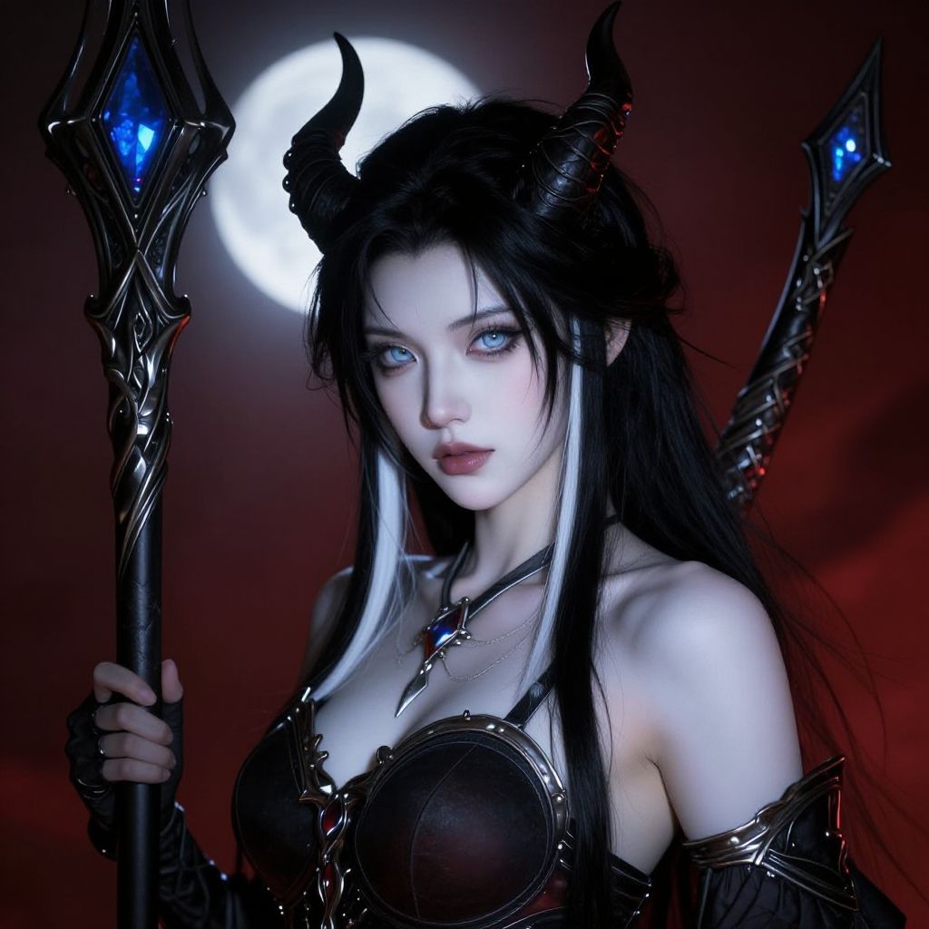 Demon girl with beautiful features, finely detailed and beautiful face, skin as white as snow, waterfall of jet-black hair with two white strands on each side framing her face, elegantly twisted small horns protruding from her forehead, eyes almost translucent and iridescent blue, athletic, strong and defined body, dressed in her battle armor and a finely ornate staff topped with a jewel of iridescent blue shine, in an eerie landscape bathed by the ethereal glow of a moon, charcoal and crimson palette, chiaroscuro lighting, digital painting, ultrafine details, dramatic lighting, 8k resolution ensuring clear and stunning realism. Landscape. The artistic style should be realistic, with meticulous attention to textures and lighting, achieving deepness through shadows, hyperrealistic, rendered with Octane, hyperornamented details. (Intimate portrait composition), Cinematic painting style.