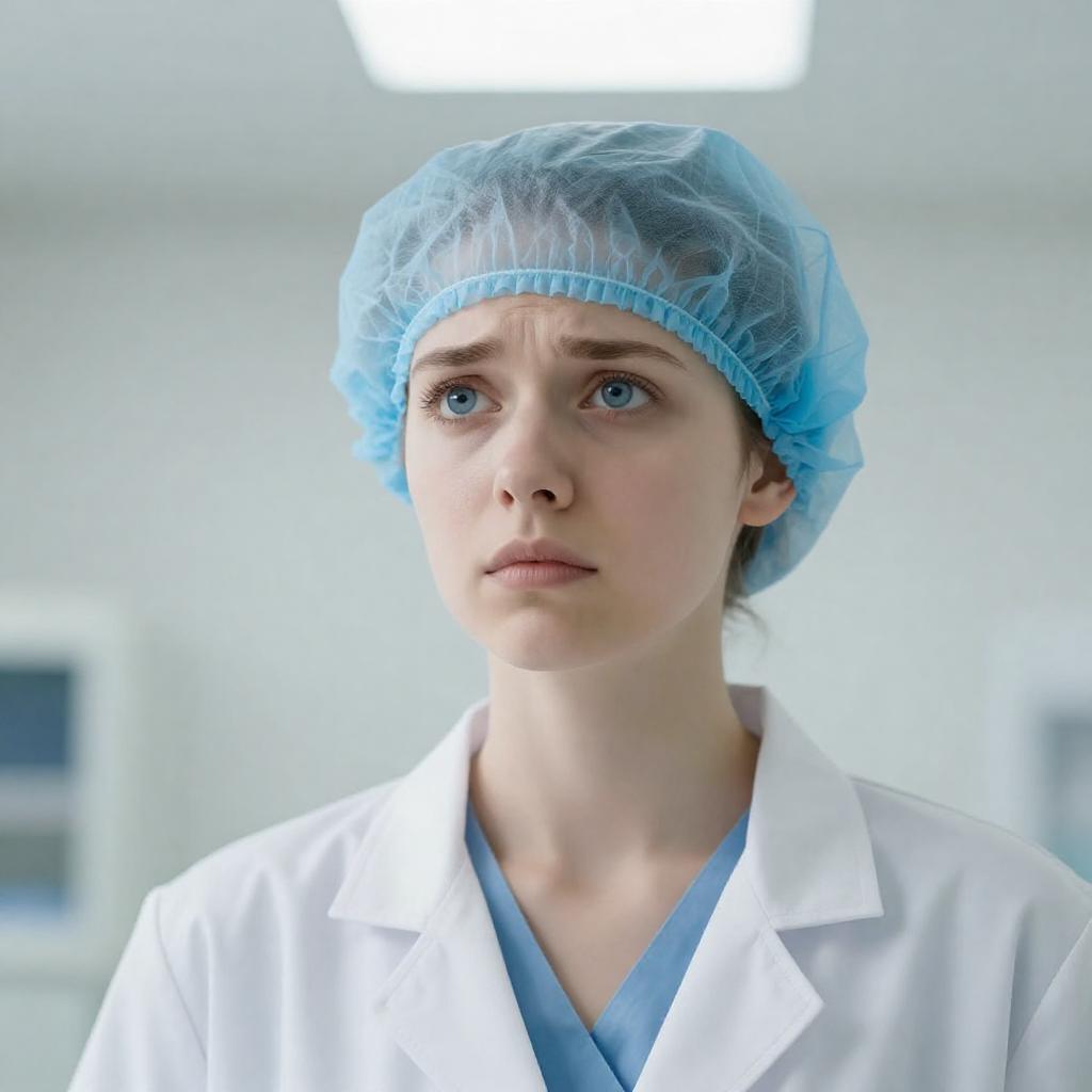 Photograph of a young woman with fair skin and blue eyes, wearing a white lab coat and a light blue surgical cap. She looks upward with a slightly concerned expression. Bright, white, hospital-like background with geometric ceiling patterns.