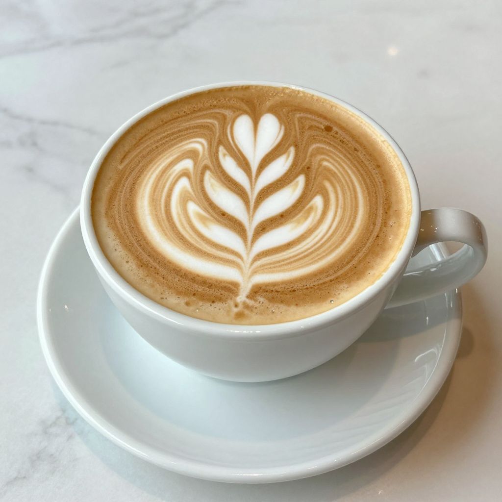 Photograph of a white ceramic cup with a latte on a matching saucer, showcasing intricate leaf-shaped foam art on top.
