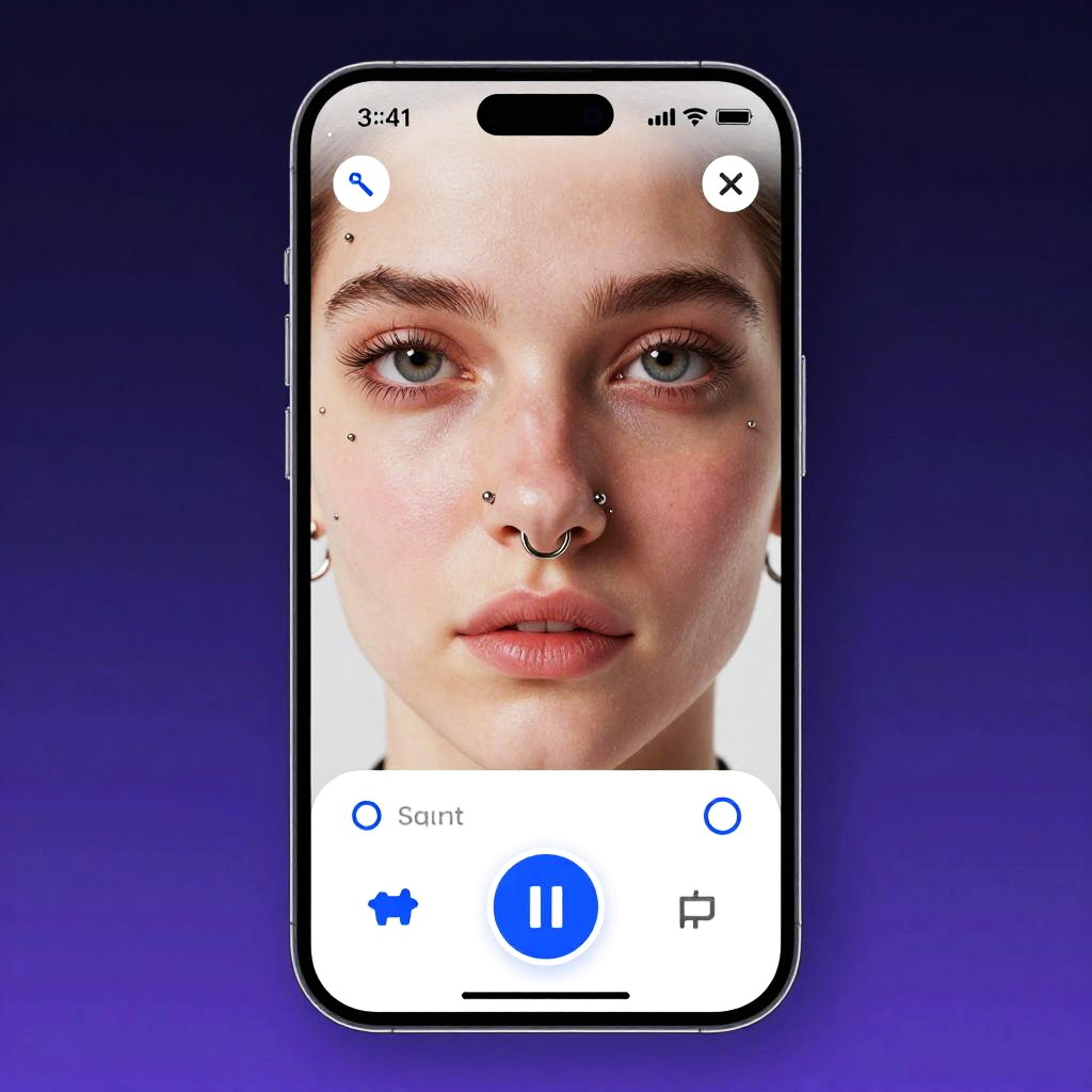 Nose piercing simulator app screen showing a high-definition model with adjustable angles, numerous piercing choices such as hoops, studs, spikes, all rendered in photorealistic detail, intuitive user controls, futuristic digital environment with smooth gradients.